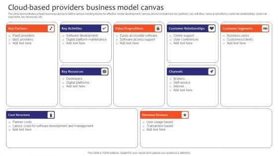 The slide demonstrates a SaaS business canvas to define various building blocks for effective model development. Various blocks included are key partners, key activities, value propositions, customer relationships, customer segments, key resources, etc. Showcasing this set of slides titled Cloud Based Providers Business Model Canvas Sample PDF. The topics addressed in these templates are Key Partners, Key Activities, Value Propositions, Customer Relationships, Customer Segments. All the content presented in this PPT design is completely editable. Download it and make adjustments in color, background, font etc. as per your unique business setting.