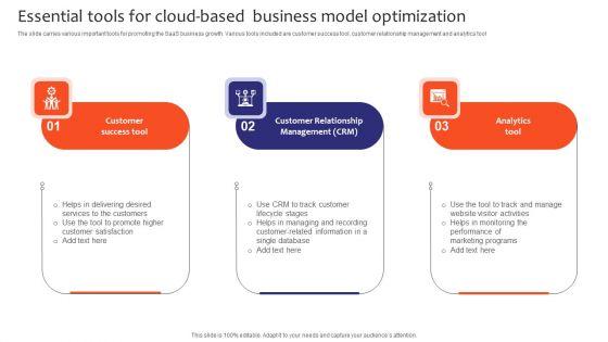 The slide carries various important tools for promoting the SaaS business growth. Various tools included are customer success tool, customer relationship management and analytics tool. Presenting Essential Tools For Cloud Based Business Model Optimization Sample PDF to dispense important information. This template comprises four stages. It also presents valuable insights into the topics including Customer Success Tool, Customer Relationship Management, Analytics Tool. This is a completely customizable PowerPoint theme that can be put to use immediately. So, download it and address the topic impactfully.