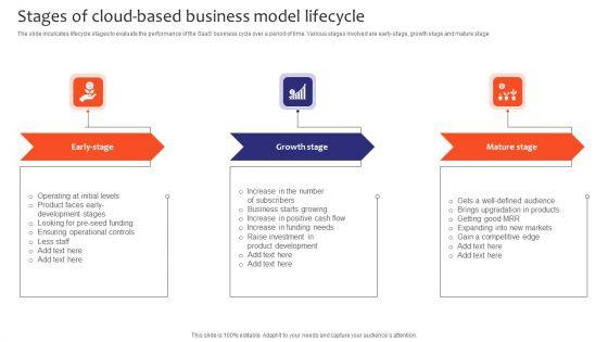 The slide inculcates lifecycle stages to evaluate the performance of the SaaS business cycle over a period of time. Various stages involved are early-stage, growth stage and mature stage. Presenting Stages Of Cloud Based Business Model Lifecycle Topics PDF to dispense important information. This template comprises three stages. It also presents valuable insights into the topics including Early-Stage, Growth Stage, Mature Stage. This is a completely customizable PowerPoint theme that can be put to use immediately. So, download it and address the topic impactfully.