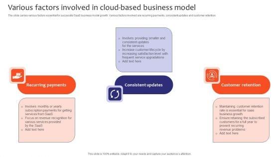 The slide carries various factors essential for successful SaaS business model growth. Various factors involved are recurring payments, consistent updates and customer retention. Presenting Various Factors Involved In Cloud Based Business Model Diagrams PDF to dispense important information. This template comprises three stages. It also presents valuable insights into the topics including Recurring Payments, Consistent Updates, Customer Retention. This is a completely customizable PowerPoint theme that can be put to use immediately. So, download it and address the topic impactfully.