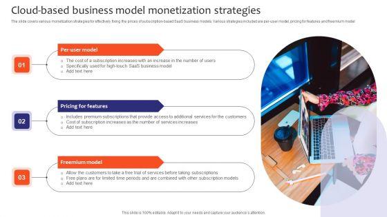 The slide covers various monetization strategies for effectively fixing the prices of subscription-based SaaS business models. Various strategies included are per-user model, pricing for features and freemium model. Presenting Cloud Based Business Model Monetization Strategies Demonstration PDF to dispense important information. This template comprises three stages. It also presents valuable insights into the topics including Per-User Model, Pricing For Features, Freemium Model. This is a completely customizable PowerPoint theme that can be put to use immediately. So, download it and address the topic impactfully.