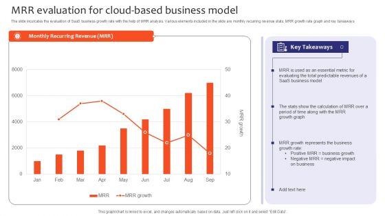 The slide inculcates the evaluation of SaaS business growth rate with the help of MRR analysis. Various elements included in the slide are monthly recurring revenue stats, MRR growth rate graph and key takeaways. Showcasing this set of slides titled MRR Evaluation For Cloud Based Business Model Slides PDF. The topics addressed in these templates are Total Predictable Revenues, Saas Business Model, Growth Graph, Business Growth. All the content presented in this PPT design is completely editable. Download it and make adjustments in color, background, font etc. as per your unique business setting.