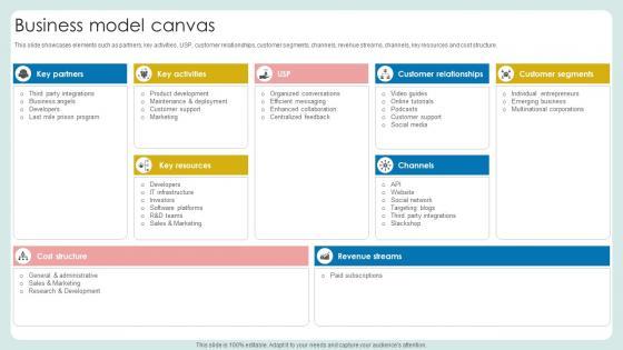 This slide showcases customer touchpoints such as API, website, social network, targeting blogs, third party integrations and slackshop. From laying roadmaps to briefing everything in detail, our templates are perfect for you. You can set the stage with your presentation slides. All you have to do is download these easy-to-edit and customizable templates. Key Channels Cloud Based Communication Platform Business Model BMC SS V will help you deliver an outstanding performance that everyone would remember and praise you for. Do download this presentation today. This slide showcases customer touchpoints such as API, website, social network, targeting blogs, third party integrations and slackshop.