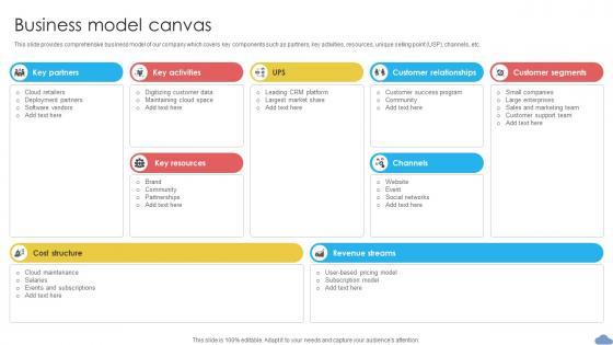 This slide provides comprehensive business model of our company which covers key components such as partners, key activities, resources, unique selling point USP, channels, etc. Find a pre-designed and impeccable Business Model Canvas Cloud Based CRM Business Model BMC SS V. The templates can ace your presentation without additional effort. You can download these easy-to-edit presentation templates to make your presentation stand out from others. So, what are you waiting for Download the template from Slidegeeks today and give a unique touch to your presentation. This slide provides comprehensive business model of our company which covers key components such as partners, key activities, resources, unique selling point USP, channels, etc.