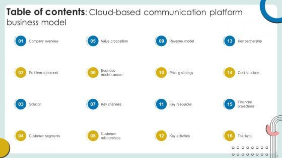 If you are looking for a format to display your unique thoughts, then the professionally designed Table Of Contents Cloud Based Communication Platform Business Model BMC SS V is the one for you. You can use it as a Google Slides template or a PowerPoint template. Incorporate impressive visuals, symbols, images, and other charts. Modify or reorganize the text boxes as you desire. Experiment with shade schemes and font pairings. Alter, share or cooperate with other people on your work. Download Table Of Contents Cloud Based Communication Platform Business Model BMC SS V and find out how to give a successful presentation. Present a perfect display to your team and make your presentation unforgettable. Our Table Of Contents Cloud Based Communication Platform Business Model BMC SS V are topically designed to provide an attractive backdrop to any subject. Use them to look like a presentation pro.