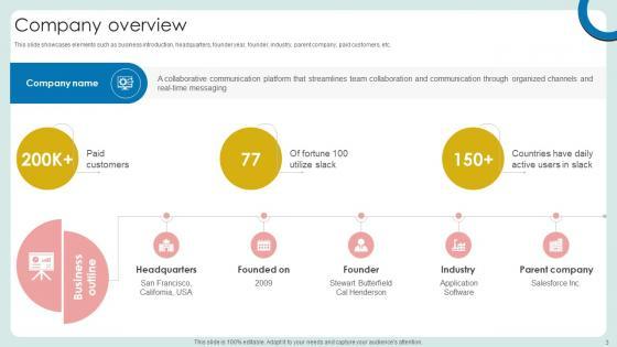 This slide showcases elements such as business introduction, headquarters, founder year, founder, industry, parent company, paid customers, etc. Boost your pitch with our creative Company Overview Cloud Based Communication Platform Business Model BMC SS V. Deliver an awe-inspiring pitch that will mesmerize everyone. Using these presentation templates you will surely catch everyones attention. You can browse the ppts collection on our website. We have researchers who are experts at creating the right content for the templates. So you do not have to invest time in any additional work. Just grab the template now and use them. This slide showcases elements such as business introduction, headquarters, founder year, founder, industry, parent company, paid customers, etc.