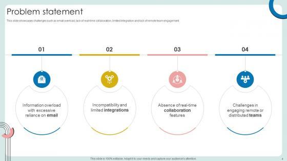This slide showcases challenges such as email overload, lack of real-time collaboration, limited integration and lack of remote team engagement. Whether you have daily or monthly meetings, a brilliant presentation is necessary. Problem Statement Cloud Based Communication Platform Business Model BMC SS V can be your best option for delivering a presentation. Represent everything in detail using Problem Statement Cloud Based Communication Platform Business Model BMC SS V and make yourself stand out in meetings. The template is versatile and follows a structure that will cater to your requirements. All the templates prepared by Slidegeeks are easy to download and edit. Our research experts have taken care of the corporate themes as well. So, give it a try and see the results. This slide showcases challenges such as email overload, lack of real-time collaboration, limited integration and lack of remote team engagement.