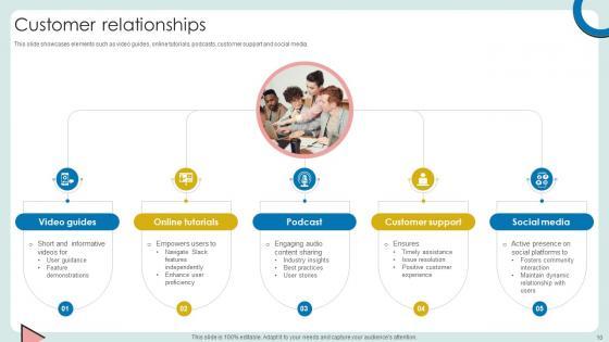 This slide showcases elements such as video guides, online tutorials, podcasts, customer support and social media. Slidegeeks is one of the best resources for PowerPoint templates. You can download easily and regulate Customer Relationships Cloud Based Communication Platform Business Model BMC SS V for your personal presentations from our wonderful collection. A few clicks is all it takes to discover and get the most relevant and appropriate templates. Use our Templates to add a unique zing and appeal to your presentation and meetings. All the slides are easy to edit and you can use them even for advertisement purposes. This slide showcases elements such as video guides, online tutorials, podcasts, customer support and social media.