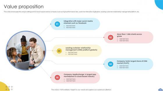 This slide showcases the unique selling point of cloud-based service company such as high performance rate, customer interaction digitization, leading customer relationship management platform, etc. Are you in need of a template that can accommodate all of your creative concepts This one is crafted professionally and can be altered to fit any style. Use it with Google Slides or PowerPoint. Include striking photographs, symbols, depictions, and other visuals. Fill, move around, or remove text boxes as desired. Test out color palettes and font mixtures. Edit and save your work, or work with colleagues. Download Value Proposition Cloud Based CRM Business Model BMC SS V and observe how to make your presentation outstanding. Give an impeccable presentation to your group and make your presentation unforgettable. This slide showcases the unique selling point of cloud-based service company such as high performance rate, customer interaction digitization, leading customer relationship management platform, etc.