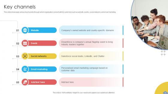 This slide showcases various touch points through which organization connect with its customers such as website, events, social networks, and email marketing. From laying roadmaps to briefing everything in detail, our templates are perfect for you. You can set the stage with your presentation slides. All you have to do is download these easy-to-edit and customizable templates. Key Channels Cloud Based CRM Business Model BMC SS V will help you deliver an outstanding performance that everyone would remember and praise you for. Do download this presentation today. This slide showcases various touch points through which organization connect with its customers such as website, events, social networks, and email marketing.