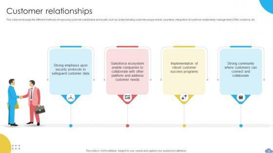 This slide showcases the different methods of improving customer satisfaction and loyalty such as understanding customer unique needs, seamless integration of customer relationship management CRM solutions, etc. Slidegeeks is one of the best resources for PowerPoint templates. You can download easily and regulate Customer Relationships Cloud Based CRM Business Model BMC SS V for your personal presentations from our wonderful collection. A few clicks is all it takes to discover and get the most relevant and appropriate templates. Use our Templates to add a unique zing and appeal to your presentation and meetings. All the slides are easy to edit and you can use them even for advertisement purposes. This slide showcases the different methods of improving customer satisfaction and loyalty such as understanding customer unique needs, seamless integration of customer relationship management CRM solutions, etc.