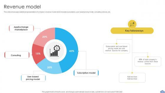 This slide showcases statistical representation of companys revenue model which includes subscription, user-based pricing model, consulting services, etc. Find highly impressive Revenue Model Cloud Based CRM Business Model BMC SS V on Slidegeeks to deliver a meaningful presentation. You can save an ample amount of time using these presentation templates. No need to worry to prepare everything from scratch because Slidegeeks experts have already done a huge research and work for you. You need to download Revenue Model Cloud Based CRM Business Model BMC SS V for your upcoming presentation. All the presentation templates are 100 percent editable and you can change the color and personalize the content accordingly. Download now This slide showcases statistical representation of companys revenue model which includes subscription, user-based pricing model, consulting services, etc.
