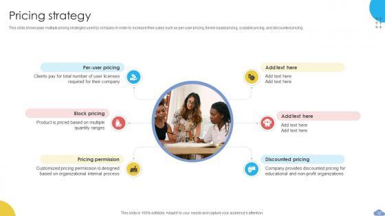 This slide showcases multiple pricing strategies used by company in order to increase their sales such as per-user pricing, tiered-based pricing, scalable pricing, and discounted pricing. Do you have an important presentation coming up Are you looking for something that will make your presentation stand out from the rest Look no further than Pricing Strategy Cloud Based CRM Business Model BMC SS V. With our professional designs, you can trust that your presentation will pop and make delivering it a smooth process. And with Slidegeeks, you can trust that your presentation will be unique and memorable. So why wait Grab Pricing Strategy Cloud Based CRM Business Model BMC SS V today and make your presentation stand out from the rest This slide showcases multiple pricing strategies used by company in order to increase their sales such as per-user pricing, tiered-based pricing, scalable pricing, and discounted pricing.