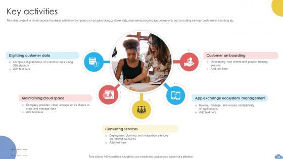 This slide covers the most important business activities of company such as automating customer data, maintaining cloud space, professional and consulting services, customer on boarding, etc.Get a simple yet stunning designed Key Activities Cloud Based CRM Business Model BMC SS V. It is the best one to establish the tone in your meetings. It is an excellent way to make your presentations highly effective. So, download this PPT today from Slidegeeks and see the positive impacts. Our easy-to-edit Key Activities Cloud Based CRM Business Model BMC SS V can be your go-to option for all upcoming conferences and meetings. So, what are you waiting for Grab this template today. This slide covers the most important business activities of company such as automating customer data, maintaining cloud space, professional and consulting services, customer on boarding, etc.