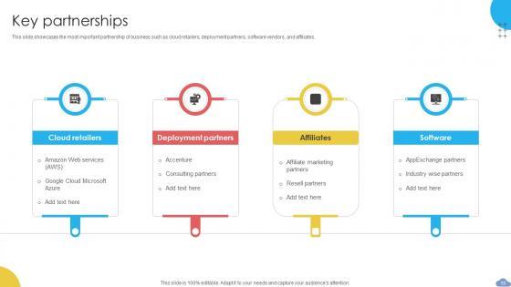 This slide showcases the most important partnership of business such as cloud retailers, deployment partners, software vendors, and affiliates. Present like a pro with Key Partnerships Cloud Based CRM Business Model BMC SS V. Create beautiful presentations together with your team, using our easy-to-use presentation slides. Share your ideas in real-time and make changes on the fly by downloading our templates. So whether you are in the office, on the go, or in a remote location, you can stay in sync with your team and present your ideas with confidence. With Slidegeeks presentation got a whole lot easier. Grab these presentations today. This slide showcases the most important partnership of business such as cloud retailers, deployment partners, software vendors, and affiliates.