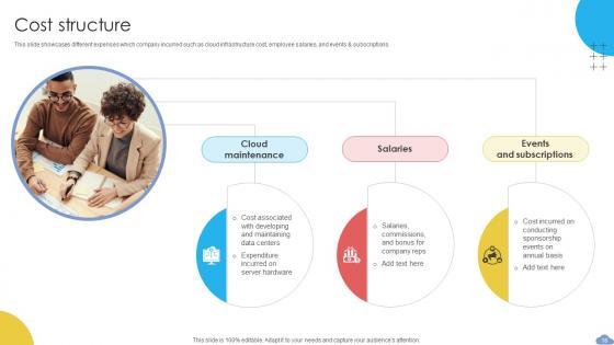 This slide showcases expenses such as research and development, sales and marketing and general and administrative. Create an editable Cost Structure Cloud Based Communication Platform Business Model BMC SS V that communicates your idea and engages your audience. Whether you are presenting a business or an educational presentation, pre-designed presentation templates help save time. Cost Structure Cloud Based Communication Platform Business Model BMC SS V is highly customizable and very easy to edit, covering many different styles from creative to business presentations. Slidegeeks has creative team members who have crafted amazing templates. So, go and get them without any delay. This slide showcases expenses such as research and development, sales and marketing and general and administrative.