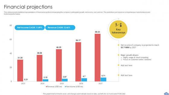 This slide presents statistical representation of financial projections showcasing the companys anticipated growth, net income, cost, and risk. The predictions are based on comprehensive market analysis and historical performance. There are so many reasons you need a Financial Projections Cloud Based CRM Business Model BMC SS V. The first reason is you can not spend time making everything from scratch, Thus, Slidegeeks has made presentation templates for you too. You can easily download these templates from our website easily. This slide presents statistical representation of financial projections showcasing the companys anticipated growth, net income, cost, and risk. The predictions are based on comprehensive market analysis and historical performance.