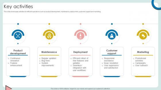 This slide showcases activities for efficient operations such as product development, maintenance, deployment, customer support and marketing. Get a simple yet stunning designed Key Activities Cloud Based Communication Platform Business Model BMC SS V. It is the best one to establish the tone in your meetings. It is an excellent way to make your presentations highly effective. So, download this PPT today from Slidegeeks and see the positive impacts. Our easy-to-edit Key Activities Cloud Based Communication Platform Business Model BMC SS V can be your go-to option for all upcoming conferences and meetings. So, what are you waiting for Grab this template today. This slide showcases activities for efficient operations such as product development, maintenance, deployment, customer support and marketing.