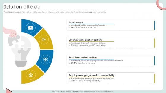 This slide showcases solutions such as email usage, extensive integration options, real-time collaboration and employee engagement and connectivity. If your project calls for a presentation, then Slidegeeks is your go-to partner because we have professionally designed, easy-to-edit templates that are perfect for any presentation. After downloading, you can easily edit Solution Offered Cloud Based Communication Platform Business Model BMC SS V and make the changes accordingly. You can rearrange slides or fill them with different images. Check out all the handy templates This slide showcases solutions such as email usage, extensive integration options, real-time collaboration and employee engagement and connectivity.