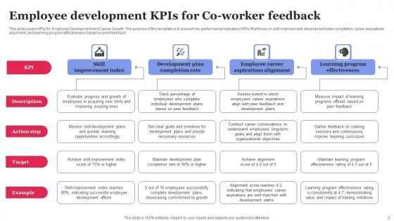 This slide covers KPIs for Employee Development and Career Growth. The purpose of this template is to present key performance indicators KPIs that focus on skill improvement, development plan completion, career aspirations alignment, and learning program effectiveness based on peer feedback. Pitch your topic with ease and precision using this Employee Development KPIS For Co Worker Feedback Structure Pdf This layout presents information on Skill Improvement, Development Plan, Aspirations Alignment It is also available for immediate download and adjustment. So, changes can be made in the color, design, graphics or any other component to create a unique layout. This slide covers KPIs for Employee Development and Career Growth. The purpose of this template is to present key performance indicators KPIs that focus on skill improvement, development plan completion, career aspirations alignment, and learning program effectiveness based on peer feedback.