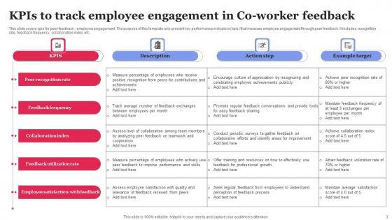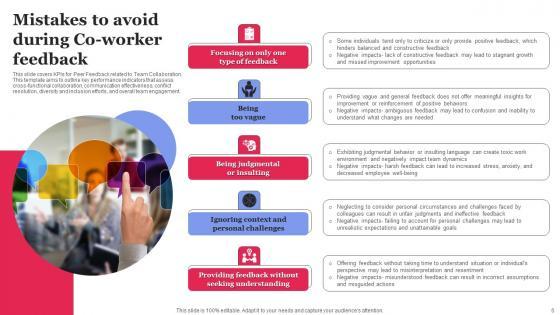 This slide covers KPIs for Peer Feedback related to Team Collaboration. This template aims to outline key performance indicators that assess cross-functional collaboration, communication effectiveness, conflict resolution, diversity and inclusion efforts, and overall team engagement. Pitch your topic with ease and precision using this Mistakes To Avoid During Co Worker Feedback Template Pdf This layout presents information on Being Too Vague, Being Judgmental Or Insulting, Ignoring Context It is also available for immediate download and adjustment. So, changes can be made in the color, design, graphics or any other component to create a unique layout. This slide covers KPIs for Peer Feedback related to Team Collaboration. This template aims to outline key performance indicators that assess cross-functional collaboration, communication effectiveness, conflict resolution, diversity and inclusion efforts, and overall team engagement.