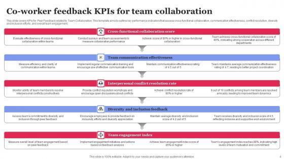 This slide covers KPIs for Peer Feedback related to Team Collaboration. This template aims to outline key performance indicators that assess cross-functional collaboration, communication effectiveness, conflict resolution, diversity and inclusion efforts, and overall team engagement. Pitch your topic with ease and precision using this Co Worker Feedback KPIS For Team Collaboration Pictures Pdf This layout presents information on Cross Functional, Team Communication, Team Engagement It is also available for immediate download and adjustment. So, changes can be made in the color, design, graphics or any other component to create a unique layout. This slide covers KPIs for Peer Feedback related to Team Collaboration. This template aims to outline key performance indicators that assess cross-functional collaboration, communication effectiveness, conflict resolution, diversity and inclusion efforts, and overall team engagement.