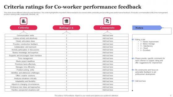 This slide shows different criteria for peer feedback. This slide highlights the important criteria needed to be covered while conducting and providing peer performance feedback. It includes communication skills, time management, problem-solving skills, adaptability, flexibility, etc. Pitch your topic with ease and precision using this Criteria Ratings For Co Worker Performance Feedback Formats Pdf This layout presents information on Communication Skills, Constructive Feedback, Project Deadlines It is also available for immediate download and adjustment. So, changes can be made in the color, design, graphics or any other component to create a unique layout. This slide shows different criteria for peer feedback. This slide highlights the important criteria needed to be covered while conducting and providing peer performance feedback. It includes communication skills, time management, problem-solving skills, adaptability, flexibility, etc.