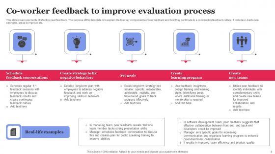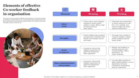 This slide covers elements of effective peer feedback. The purpose of this template is to explain the four key components of peer feedback and how they contribute to a constructive feedback culture. It includes Likert scale, strengths, areas to improve, etc. Pitch your topic with ease and precision using this Co Worker Feedback To Improve Evaluation Process Elements Pdf This layout presents information on Schedule Feedback, Negative Behaviors, Create Learning Program It is also available for immediate download and adjustment. So, changes can be made in the color, design, graphics or any other component to create a unique layout. This slide covers elements of effective peer feedback. The purpose of this template is to explain the four key components of peer feedback and how they contribute to a constructive feedback culture. It includes Likert scale, strengths, areas to improve, etc.