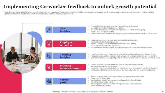 This slide covers the benefits of developing peer feedback within an organization. This template aims to highlight the importance of peer feedback and its positive impact on various aspects of employee development and organizational culture. It includes new insights, employee retention, training insights, career paths, etc. Pitch your topic with ease and precision using this Implementing Co Worker Feedback To Unlock Growth Potential Structure Pdf This layout presents information on Employee Retention, Training Insights, Building Remote Culture It is also available for immediate download and adjustment. So, changes can be made in the color, design, graphics or any other component to create a unique layout. This slide covers the benefits of developing peer feedback within an organization. This template aims to highlight the importance of peer feedback and its positive impact on various aspects of employee development and organizational culture. It includes new insights, employee retention, training insights, career paths, etc.