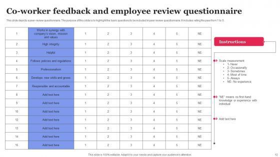 This slide depicts a peer-review questionnaire. The purpose of this slide is to highlight the basic questions to be included in peer review questionnaire. It includes rating the peer from 1 to 5. Showcasing this set of slides titled Co Worker Feedback And Employee Review Questionnaire Formats Pdf The topics addressed in these templates are Mission And Values, Develops New Skills, Professionalism All the content presented in this PPT design is completely editable. Download it and make adjustments in color, background, font etc. as per your unique business setting. This slide depicts a peer-review questionnaire. The purpose of this slide is to highlight the basic questions to be included in peer review questionnaire. It includes rating the peer from 1 to 5.