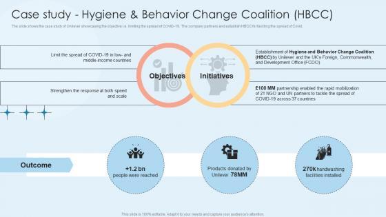 The slide shows the case study of Unilever showcasing the objective i.e. limiting the spread of COVID-19. The company partners and establish HBCC for tackling the spread of Covid.Present like a pro with Case Study Hygiene And Behavior Change Coalition HBCC Home Care Solutions Company Profile CP SS V. Create beautiful presentations together with your team, using our easy-to-use presentation slides. Share your ideas in real-time and make changes on the fly by downloading our templates. So whether you are in the office, on the go, or in a remote location, you can stay in sync with your team and present your ideas with confidence. With Slidegeeks presentation got a whole lot easier. Grab these presentations today. The slide shows the case study of Unilever showcasing the objective i.e. limiting the spread of COVID-19. The company partners and establish HBCC for tackling the spread of Covid.