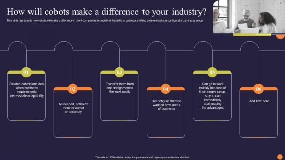 This slide represents how cobots will make a difference in client companies through their flexibility to optimize, shifting between tasks, reconfiguration, and easy setup. If your project calls for a presentation, then Slidegeeks is your go to partner because we have professionally designed, easy to edit templates that are perfect for any presentation. After downloading, you can easily edit How Will Cobots Make A Difference To Your Industry Detailed Analysis Of Cobots Portrait PDF and make the changes accordingly. You can rearrange slides or fill them with different images. Check out all the handy templates.