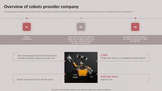 This slide depicts the overview of our cobots company, including years of experience, the total number of shipments made for robots, and the number of employees working in our organization. Slidegeeks is here to make your presentations a breeze with Revolutionizing Human Machine Collaboration Cobots Overview Of Cobots Provider Company Mockup PDF With our easy to use and customizable templates, you can focus on delivering your ideas rather than worrying about formatting. With a variety of designs to choose from, you are sure to find one that suits your needs. And with animations and unique photos, illustrations, and fonts, you can make your presentation pop. So whether you are giving a sales pitch or presenting to the board, make sure to check out Slidegeeks first.