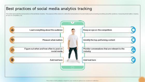 This slide represents the best practices of Social Media Analytics. The purpose of this slide is to outline the best practices of social media such as learning everything about the audience, measuring what matters, keeping an eye on competitors, etc. Want to ace your presentation in front of a live audience Our Best Practices Of Social Media Analytics Tracking Cracking The Code Of Social Media can help you do that by engaging all the users towards you. Slidegeeks experts have put their efforts and expertise into creating these impeccable powerpoint presentations so that you can communicate your ideas clearly. Moreover, all the templates are customizable, and easy-to-edit and downloadable. Use these for both personal and commercial use. This slide represents the best practices of Social Media Analytics. The purpose of this slide is to outline the best practices of social media such as learning everything about the audience, measuring what matters, keeping an eye on competitors, etc.