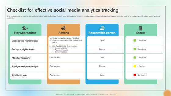 This slide represents the checklist for Social Media Analytics tracking. The purpose of this slide is to highlight the key approaches of effective Social Media Analytics such as choosing the right metrics, set up analytics tools, etc. Get a simple yet stunning designed Checklist For Effective Social Media Analytics Tracking Cracking The Code Of Social Media. It is the best one to establish the tone in your meetings. It is an excellent way to make your presentations highly effective. So, download this PPT today from Slidegeeks and see the positive impacts. Our easy-to-edit Checklist For Effective Social Media Analytics Tracking Cracking The Code Of Social Media can be your go-to option for all upcoming conferences and meetings. So, what are you waiting for Grab this template today. This slide represents the checklist for Social Media Analytics tracking. The purpose of this slide is to highlight the key approaches of effective Social Media Analytics such as choosing the right metrics, set up analytics tools, etc.