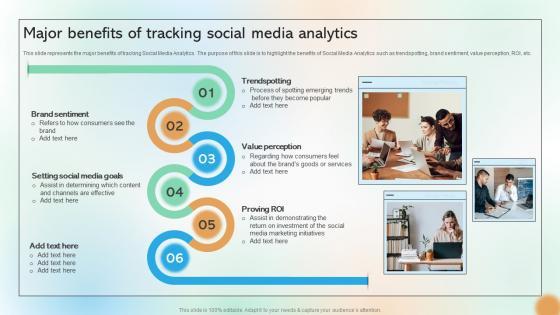 This slide represents the major benefits of tracking Social Media Analytics. The purpose of this slide is to highlight the benefits of Social Media Analytics such as trendspotting, brand sentiment, value perception, ROI, etc. Slidegeeks is one of the best resources for PowerPoint templates. You can download easily and regulate Major Benefits Of Tracking Social Media Analytics Cracking The Code Of Social Media for your personal presentations from our wonderful collection. A few clicks is all it takes to discover and get the most relevant and appropriate templates. Use our Templates to add a unique zing and appeal to your presentation and meetings. All the slides are easy to edit and you can use them even for advertisement purposes. This slide represents the major benefits of tracking Social Media Analytics. The purpose of this slide is to highlight the benefits of Social Media Analytics such as trendspotting, brand sentiment, value perception, ROI, etc.