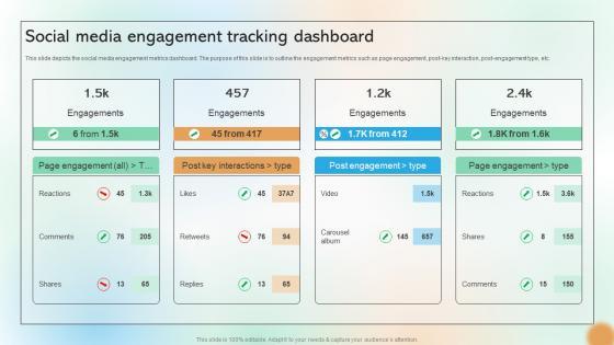 This slide depicts the social media engagement metrics dashboard. The purpose of this slide is to outline the engagement metrics such as page engagement, post key interaction, post engagement type, etc. There are so many reasons you need a Social Media Engagement Tracking Dashboard Cracking The Code Of Social Media. The first reason is you can not spend time making everything from scratch, Thus, Slidegeeks has made presentation templates for you too. You can easily download these templates from our website easily. This slide depicts the social media engagement metrics dashboard. The purpose of this slide is to outline the engagement metrics such as page engagement, post key interaction, post engagement type, etc.