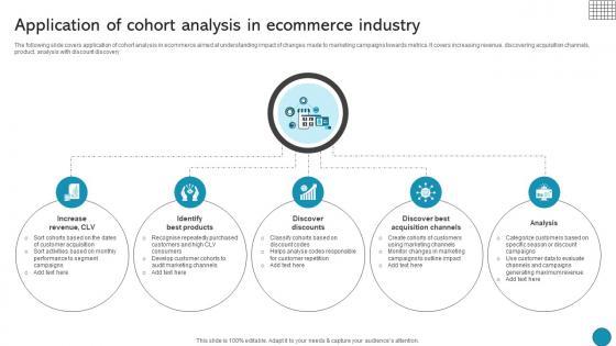 The following slide covers application of cohort analysis in ecommerce aimed at understanding impact of changes made to marketing campaigns towards metrics. It covers increasing revenue, discovering acquisition channels, product, analysis with discount discovery Boost your pitch with our creative Application Of Cohort Analysis In Ecommerce Industry Driving Business Success Integrating Product. Deliver an awe-inspiring pitch that will mesmerize everyone. Using these presentation templates you will surely catch everyones attention. You can browse the ppts collection on our website. We have researchers who are experts at creating the right content for the templates. So you do not have to invest time in any additional work. Just grab the template now and use them. The following slide covers application of cohort analysis in ecommerce aimed at understanding impact of changes made to marketing campaigns towards metrics. It covers increasing revenue, discovering acquisition channels, product, analysis with discount discovery