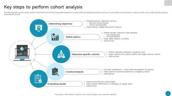 The following slide outlines steps to perform cohort analysis for helping organizations target user requirements and strategize products or services. It covers determining objectives, metrics, specific cohorts with conducting analysis and evaluating results Find a pre-designed and impeccable Key Steps To Perform Cohort Analysis Product Analytics Implementation Data Analytics V. The templates can ace your presentation without additional effort. You can download these easy-to-edit presentation templates to make your presentation stand out from others. So, what are you waiting for Download the template from Slidegeeks today and give a unique touch to your presentation. The following slide outlines steps to perform cohort analysis for helping organizations target user requirements and strategize products or services. It covers determining objectives, metrics, specific cohorts with conducting analysis and evaluating results