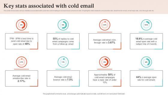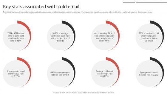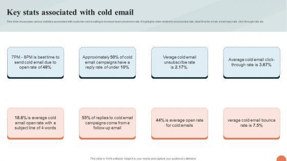 This slide showcases various statistics associated with customer cold emailing to increase lead conversion rate. It highlights stats related to unsubscribe rate, ideal time for email, email reply rate, click through rate etc. Welcome to our selection of the Key Stats Associated With Cold Email Inside Vs Outside Sales PPT Example Strategy SS V. These are designed to help you showcase your creativity and bring your sphere to life. Planning and Innovation are essential for any business that is just starting out. This collection contains the designs that you need for your everyday presentations. All of our PowerPoints are 100Percent editable, so you can customize them to suit your needs. This multi-purpose template can be used in various situations. Grab these presentation templates today. This slide showcases various statistics associated with customer cold emailing to increase lead conversion rate. It highlights stats related to unsubscribe rate, ideal time for email, email reply rate, click through rate etc.