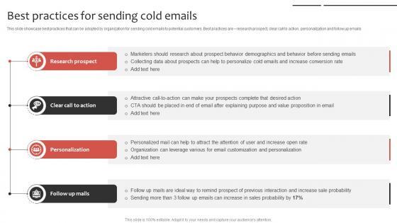 This slide showcase best practices that can be adopted by organization for sending cold emails to potential customers. Best practices are research prospect, clear call to action, personalization and follow up emails. Explore a selection of the finest Telesales Strategy For Targeting Large Best Practices For Sending Cold Emails Strategy SS V here. With a plethora of professionally designed and pre-made slide templates, you can quickly and easily find the right one for your upcoming presentation. You can use our Telesales Strategy For Targeting Large Best Practices For Sending Cold Emails Strategy SS V to effectively convey your message to a wider audience. Slidegeeks has done a lot of research before preparing these presentation templates. The content can be personalized and the slides are highly editable. Grab templates today from Slidegeeks. This slide showcase best practices that can be adopted by organization for sending cold emails to potential customers. Best practices are research prospect, clear call to action, personalization and follow up emails.