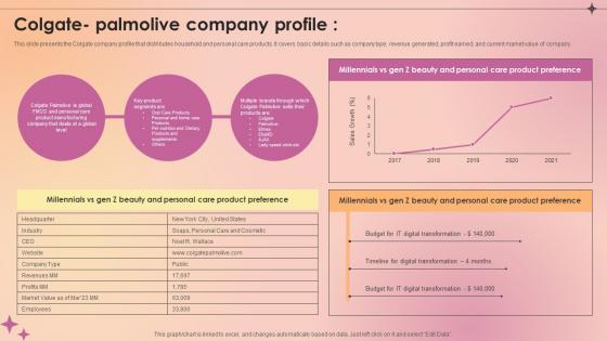 There are so many reasons you need a Colgate Palmolive Company Profile Makeup And Skincare Market IR SS V. The first reason is you can not spend time making everything from scratch, Thus, Slidegeeks has made presentation templates for you too. You can easily download these templates from our website easily. This slide presents the Colgate company profile that distributes household and personal care products. It covers basic details such as company type, revenue generated, profit earned, and current market value of company.