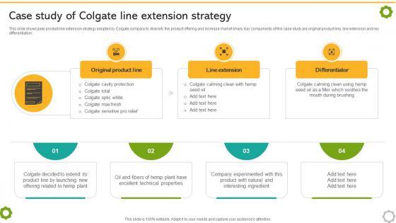 This slide showcases product line extension strategy adopted by Colgate company to diversify the product offering and increase market share. Key components of this case study are original product line, line extension and key differentiation Get a simple yet stunning designed Case Study Colgate Line Extension Leveraging Horizontal Vertical Diversification Entering Mockup Pdf. It is the best one to establish the tone in your meetings. It is an excellent way to make your presentations highly effective. So, download this PPT today from Slidegeeks and see the positive impacts. Our easy to edit Case Study Colgate Line Extension Leveraging Horizontal Vertical Diversification Entering Mockup Pdf can be your go to option for all upcoming conferences and meetings. So, what are you waiting for Grab this template today. This slide showcases product line extension strategy adopted by Colgate company to diversify the product offering and increase market share. Key components of this case study are original product line, line extension and key differentiation