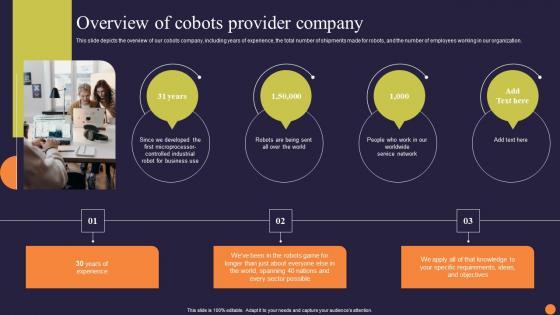 This slide depicts the overview of our cobots company, including years of experience, the total number of shipments made for robots, and the number of employees working in our organization. This modern and well-arranged Collaborative Robots IT Overview Of Cobots Provider Company Ppt Outline Background Images PDF provides lots of creative possibilities. It is very simple to customize and edit with the Powerpoint Software. Just drag and drop your pictures into the shapes. All facets of this template can be edited with Powerpoint no extra software is necessary. Add your own material, put your images in the places assigned for them, adjust the colors, and then you can show your slides to the world, with an animated slide included.