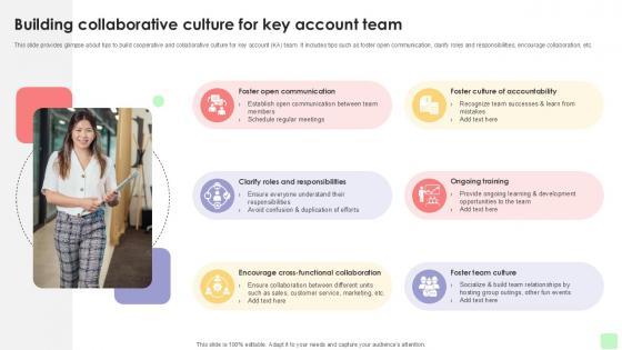This slide provides glimpse about tips to build cooperative and collaborative culture for key account KA team. It includes tips such as foster open communication, clarify roles and responsibilities, encourage collaboration, etc. Dont compromise on a template that erodes your messages impact. Introducing our engaging Building Collaborative Culture Detailed Business Account PPT Template Strategy SS V complete deck, thoughtfully crafted to grab your audiences attention instantly. With this deck, effortlessly download and adjust elements, streamlining the customization process. Whether youre using Microsoft versions or Google Slides, it fits seamlessly into your workflow. Furthermore, its accessible in JPG, JPEG, PNG, and PDF formats, facilitating easy sharing and editing. Not only that you also play with the color theme of your slides making it suitable as per your audiences preference. This slide provides glimpse about tips to build cooperative and collaborative culture for key account KA team. It includes tips such as foster open communication, clarify roles and responsibilities, encourage collaboration, etc.