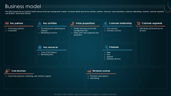 This slide presents the key business model Canavas of the task management company. It includes details about its key partners, activities, resources, value propositions, customer relationships, channels, customer segments, cost structure, and revenue streams. This Business Model Team Collaboration Platform Pitch Deck PPT Slide from Slidegeeks makes it easy to present information on your topic with precision. It provides customization options, so you can make changes to the colors, design, graphics, or any other component to create a unique layout. It is also available for immediate download, so you can begin using it right away. Slidegeeks has done good research to ensure that you have everything you need to make your presentation stand out. Make a name out there for a brilliant performance. This slide presents the key business model Canavas of the task management company. It includes details about its key partners, activities, resources, value propositions, customer relationships, channels, customer segments, cost structure, and revenue streams.