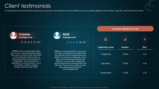 This slide presents the client testimonials provided by the our customers. It also presents the customer satisfaction score across multiple applications stores including, Google Play, App Stores and Chrome Store. Take your projects to the next level with our ultimate collection of Client Testimonials Team Collaboration Platform Pitch Deck PPT Example. Slidegeeks has designed a range of layouts that are perfect for representing task or activity duration, keeping track of all your deadlines at a glance. Tailor these designs to your exact needs and give them a truly corporate look with your own brand colors they will make your projects stand out from the rest This slide presents the client testimonials provided by the our customers. It also presents the customer satisfaction score across multiple applications stores including, Google Play, App Stores and Chrome Store.