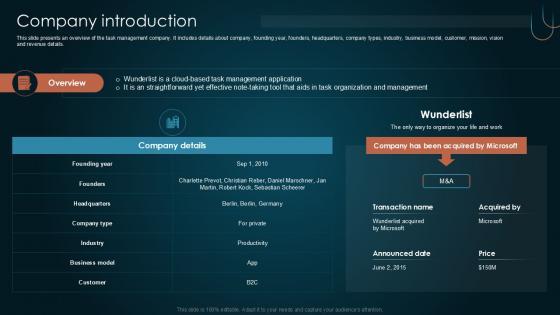 This slide presents an overview of the task management company. It includes details about company, founding year, founders, headquarters, company types, industry, business model, customer, mission, vision and revenue details. Do you know about Slidesgeeks Company Introduction Team Collaboration Platform Pitch Deck PPT Example These are perfect for delivering any kind od presentation. Using it, create PowerPoint presentations that communicate your ideas and engage audiences. Save time and effort by using our pre-designed presentation templates that are perfect for a wide range of topic. Our vast selection of designs covers a range of styles, from creative to business, and are all highly customizable and easy to edit. Download as a PowerPoint template or use them as Google Slides themes. This slide presents an overview of the task management company. It includes details about company, founding year, founders, headquarters, company types, industry, business model, customer, mission, vision and revenue details.