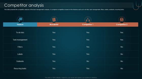 This slide presents the competitor analysis of the task management company. It compares competitors based on the features such as to-do lists, task management, filters, labels, subtasks, recurring tasks. Find a pre-designed and impeccable Competitor Analysis Team Collaboration Platform Pitch Deck PPT PowerPoint. The templates can ace your presentation without additional effort. You can download these easy-to-edit presentation templates to make your presentation stand out from others. So, what are you waiting for Download the template from Slidegeeks today and give a unique touch to your presentation. This slide presents the competitor analysis of the task management company. It compares competitors based on the features such as to-do lists, task management, filters, labels, subtasks, recurring tasks.