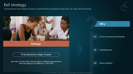 This slide presents the best exit strategy for the business. It includes information about acquisition and merger strategy , why company will choose the strategy. Want to ace your presentation in front of a live audience Our Exit Strategy Team Collaboration Platform Pitch Deck PPT Sample can help you do that by engaging all the users towards you. Slidegeeks experts have put their efforts and expertise into creating these impeccable powerpoint presentations so that you can communicate your ideas clearly. Moreover, all the templates are customizable, and easy-to-edit and downloadable. Use these for both personal and commercial use. This slide presents the best exit strategy for the business. It includes information about acquisition and merger strategy , why company will choose the strategy.